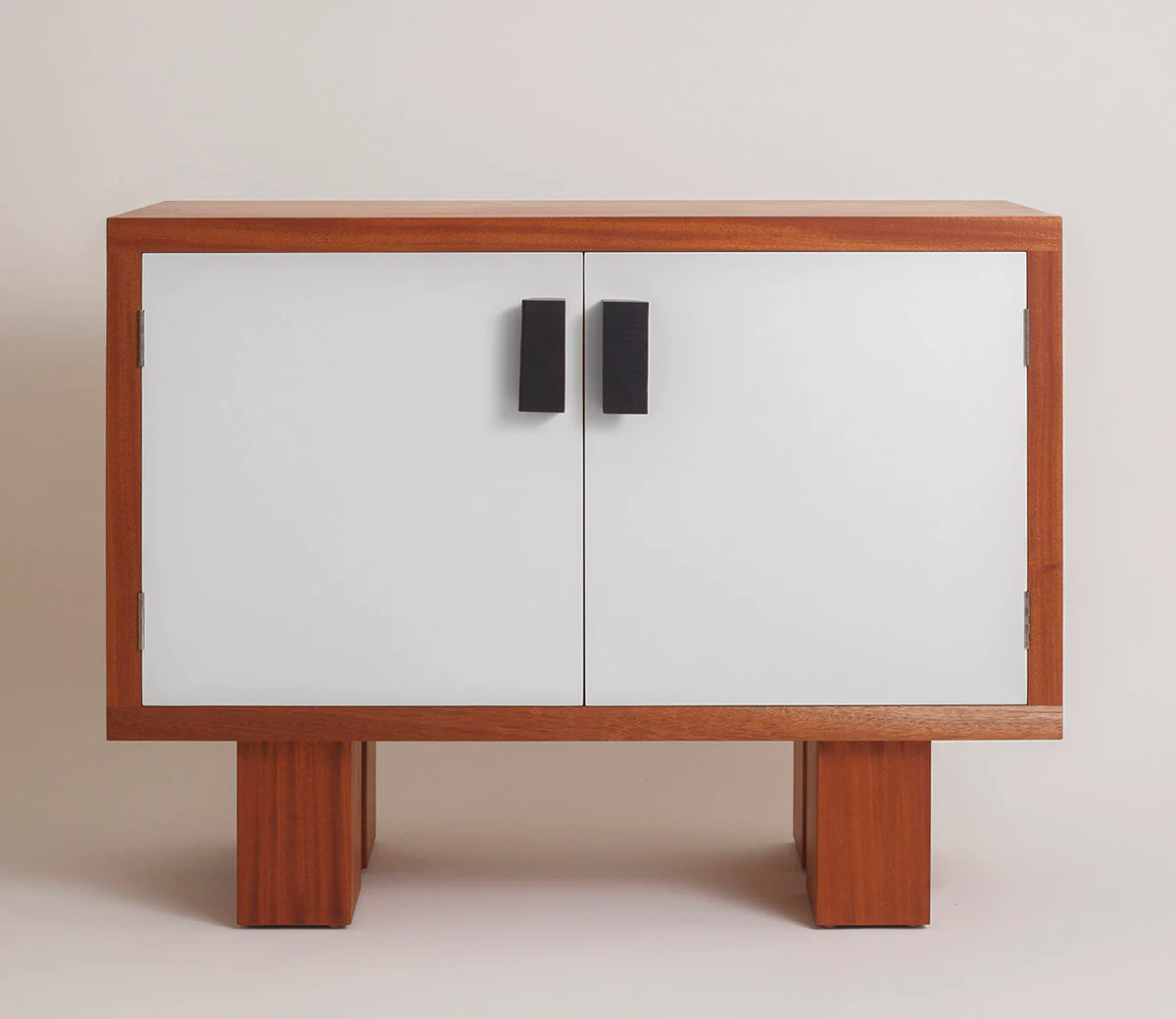 This spacious storage cabinet features a solid mahogany case, legs with an aluminum panel backing, painted plywood doors, and hand-shaped Gaboon Ebony door pulls. Inside, two shelves are adjustable to three different height options. The cabinet doors can be painted any RAL color for no additional charge.