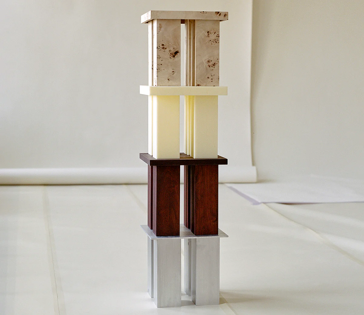 The Miter is an elemental side table that evokes mass and stability. It's available in yellow resin, raw aluminum, or burl wood, with all three versions constructed by connecting sheet materials using a miter joint.